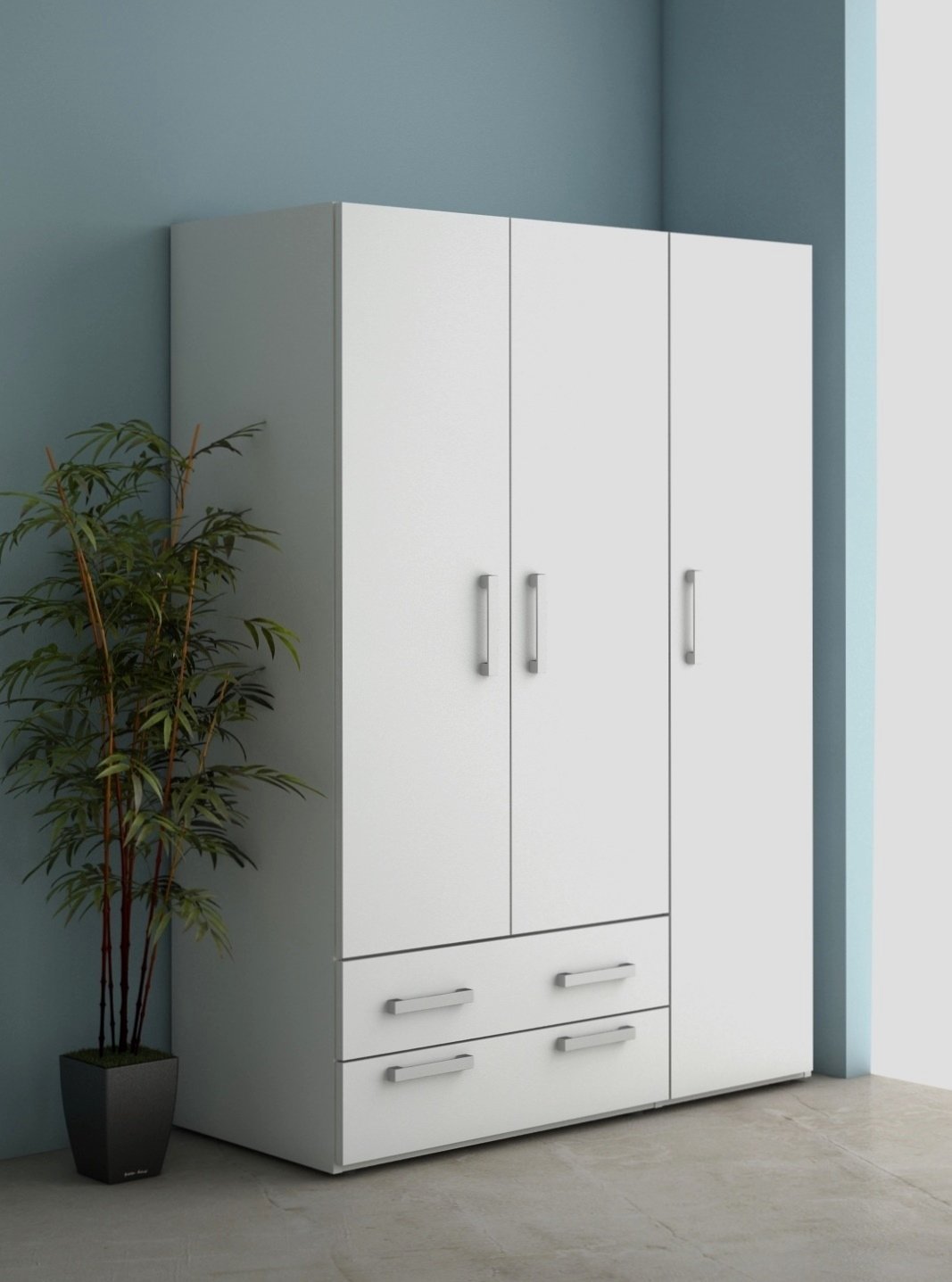 Armadio 3 ante e 2 cassetti, tutto spessore mm.18, montaggio a scomparsa (no viti a vista sui fianchi). Due barre appendiabiti in dotazione, guide metallo e piedini color alluminio