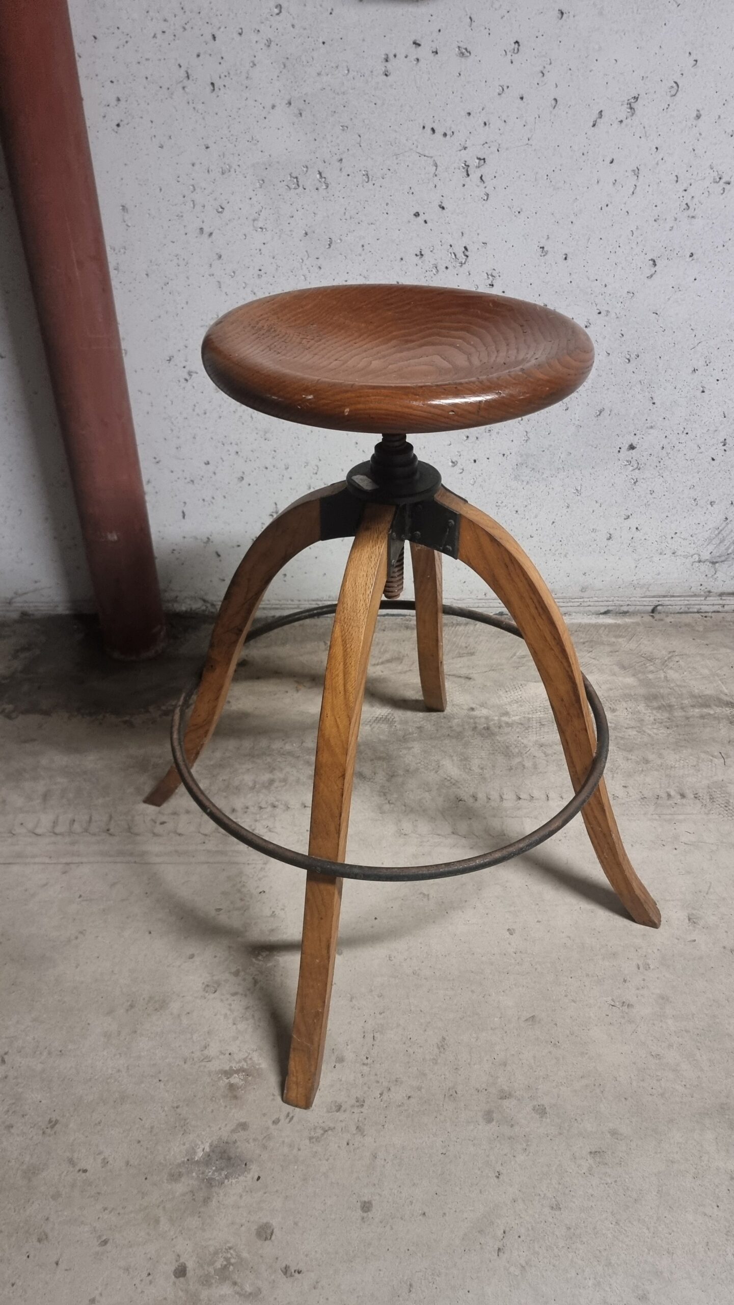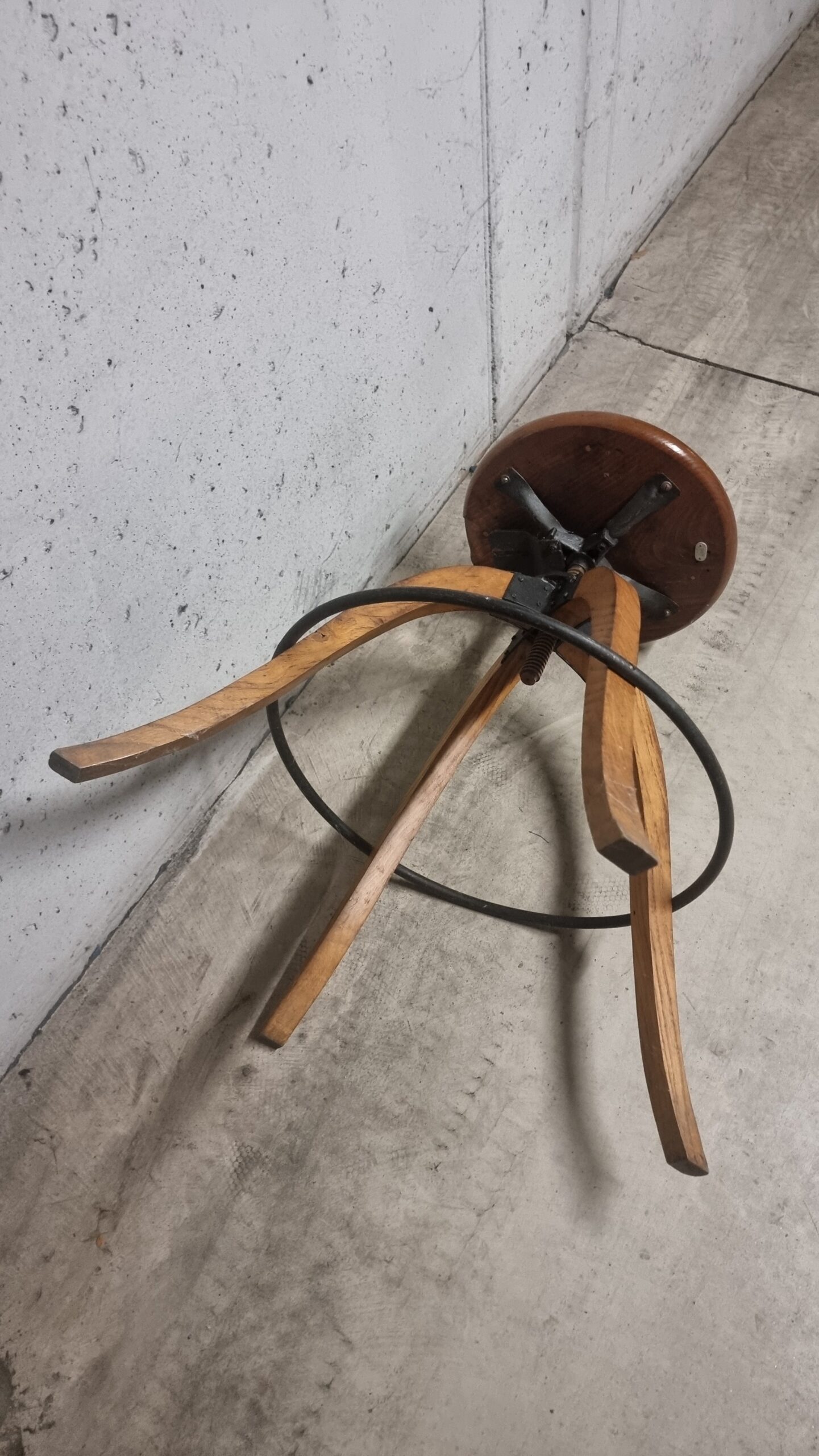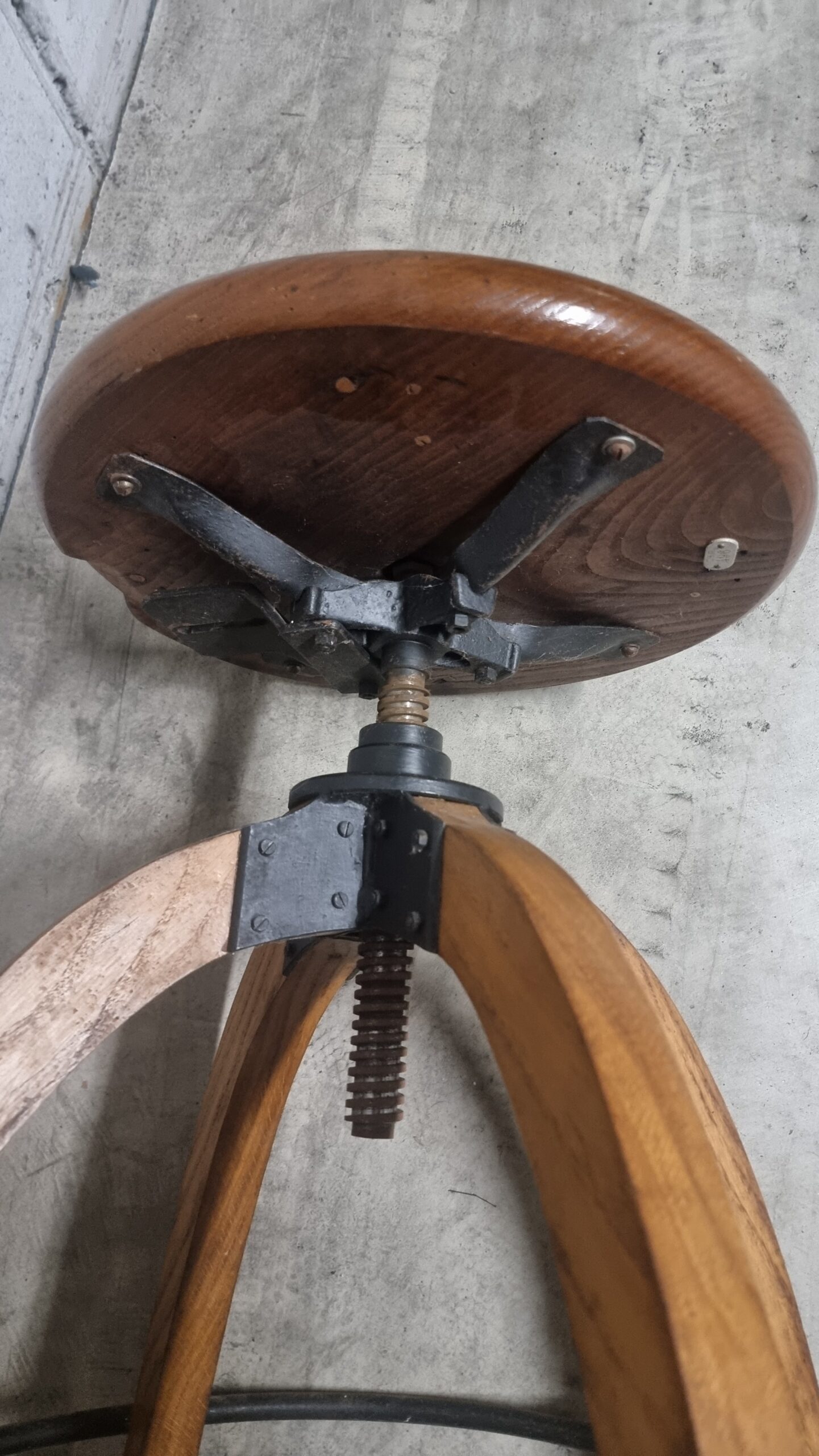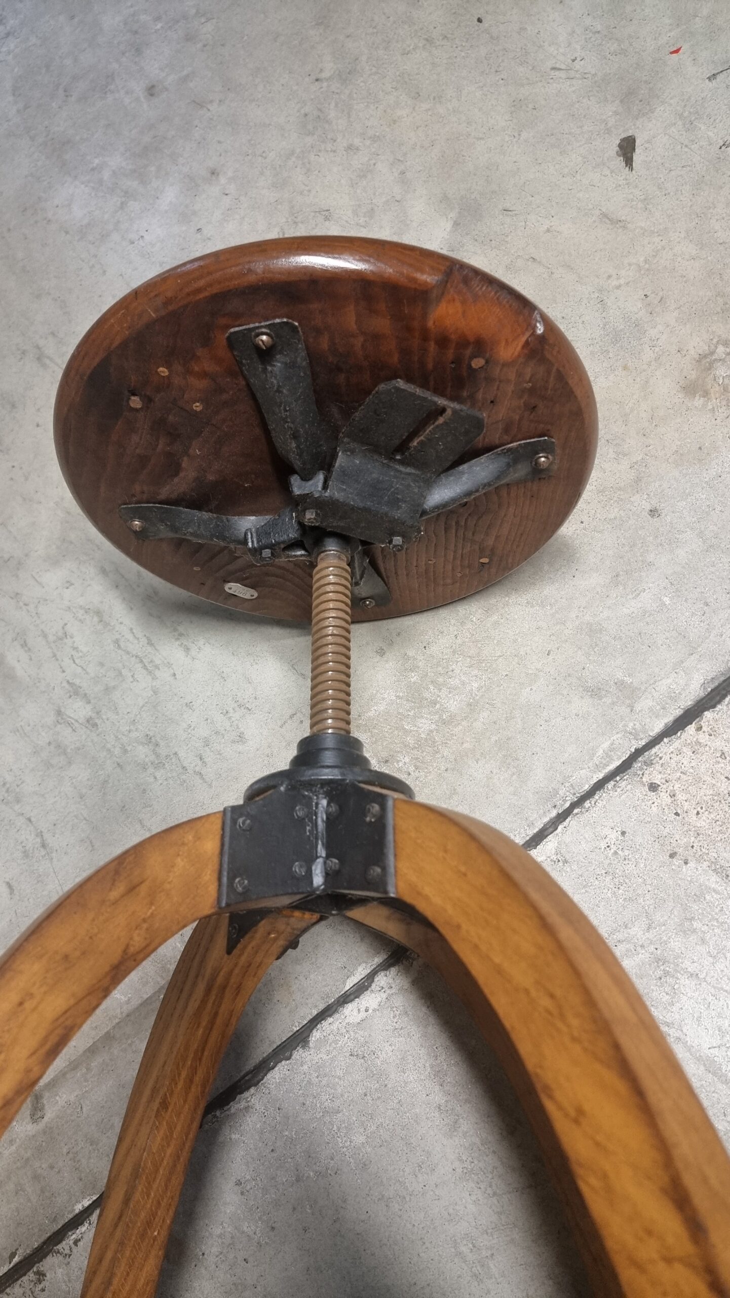 Sgabello anni ’50 in massello di rovere e ferro, regolabile in altezza, molto robusto ed estremamente decorativo.