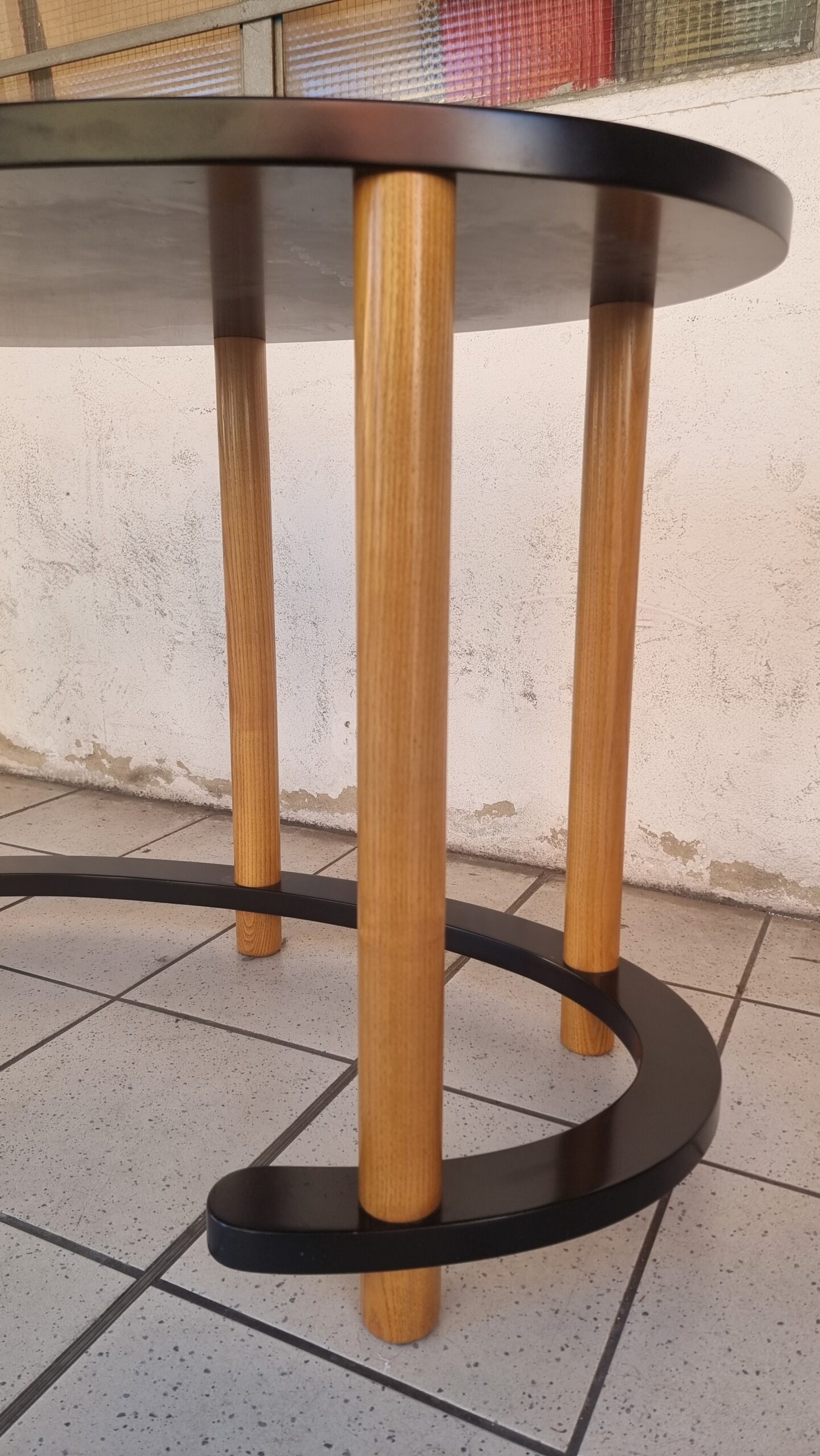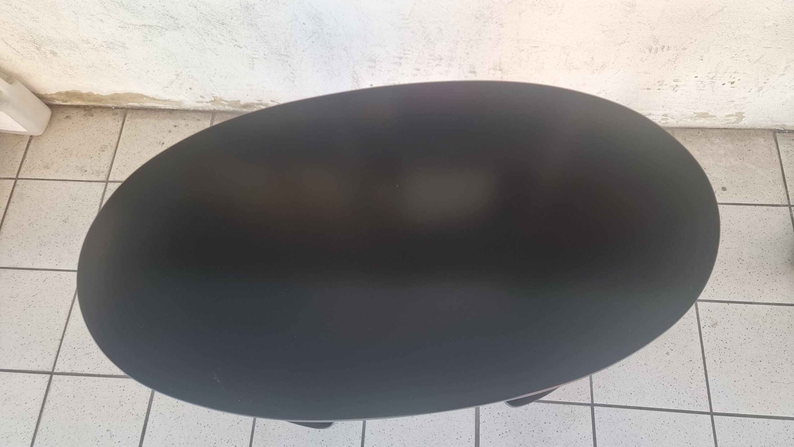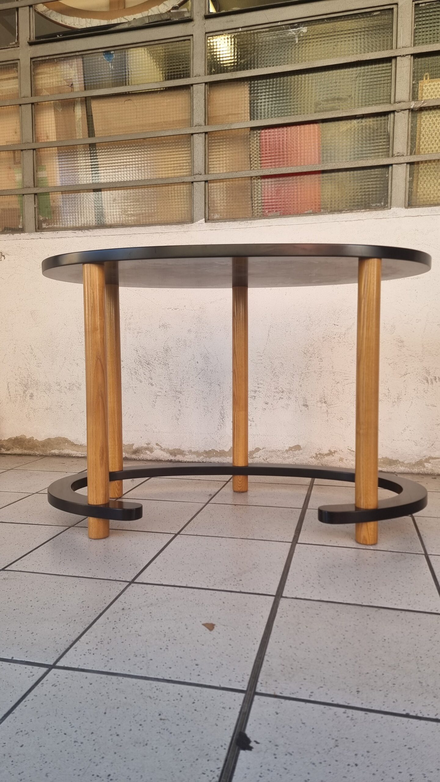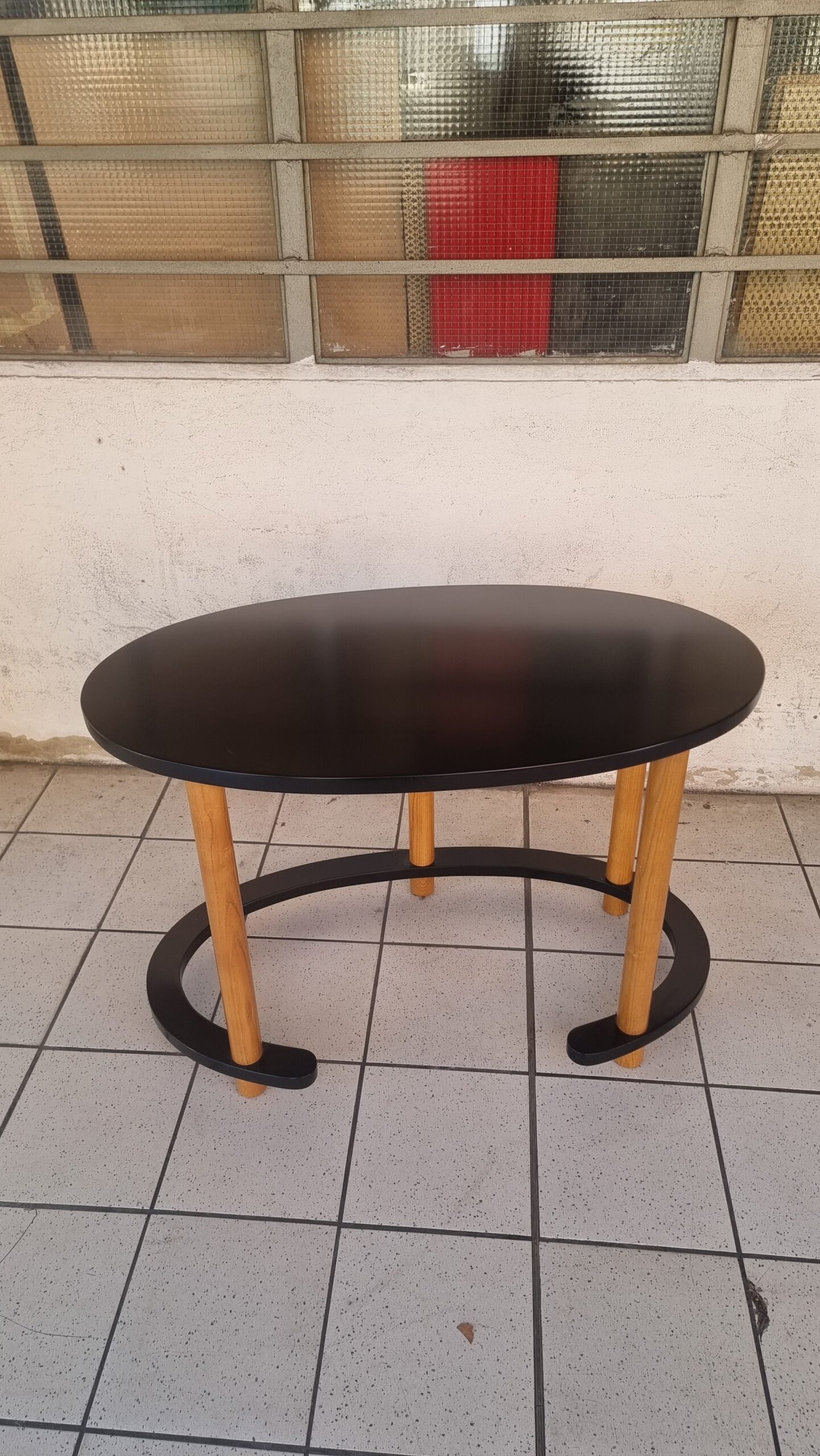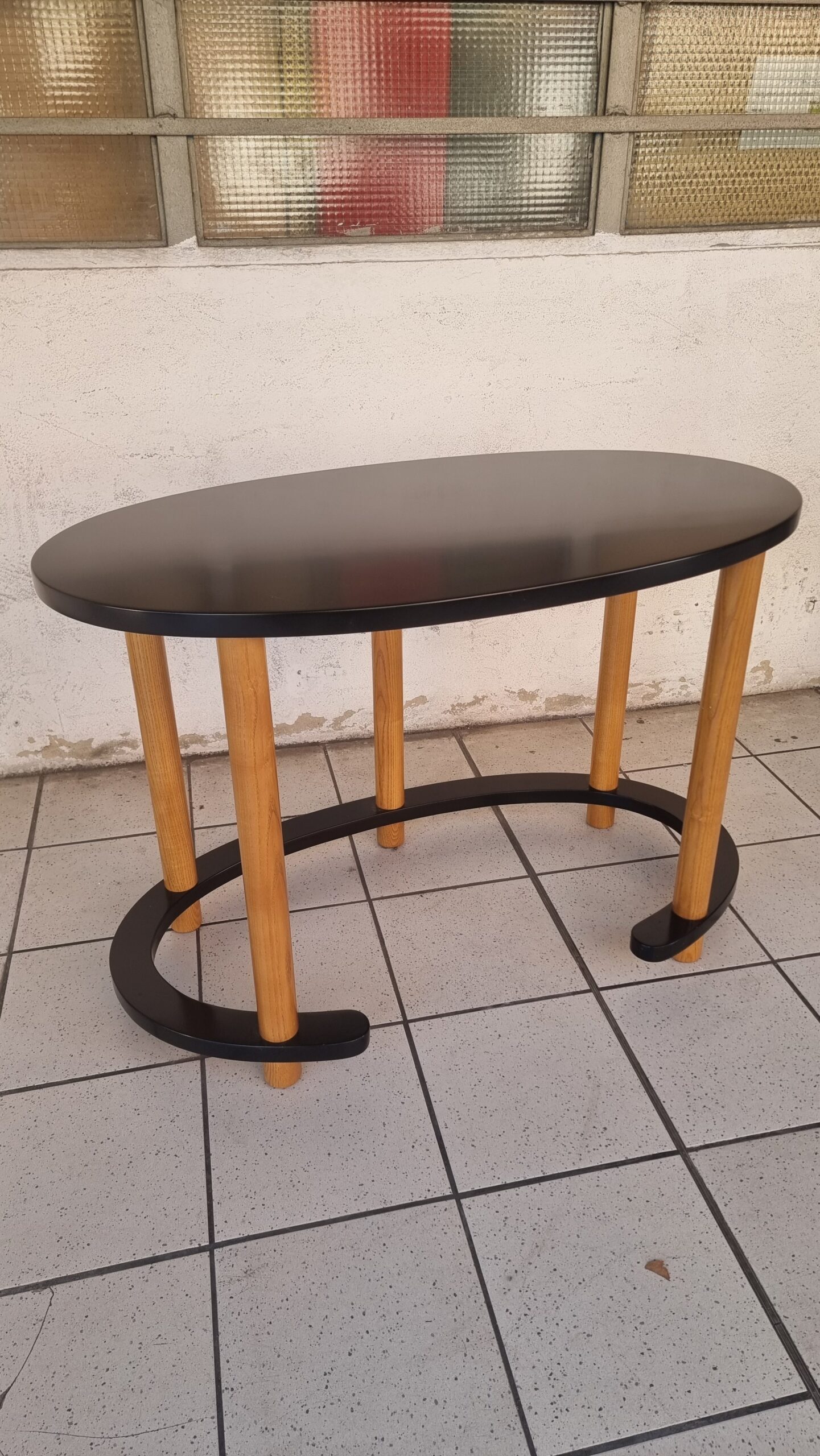 Scrivania ovale anni ’90 di ottima fattura e di peso, con piano e basamento laccati e di notevole spessore, le 5 gambe sono di legno di frassino massello.